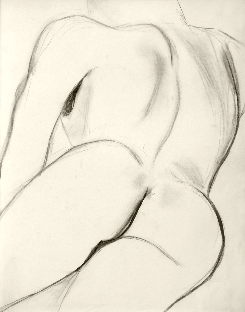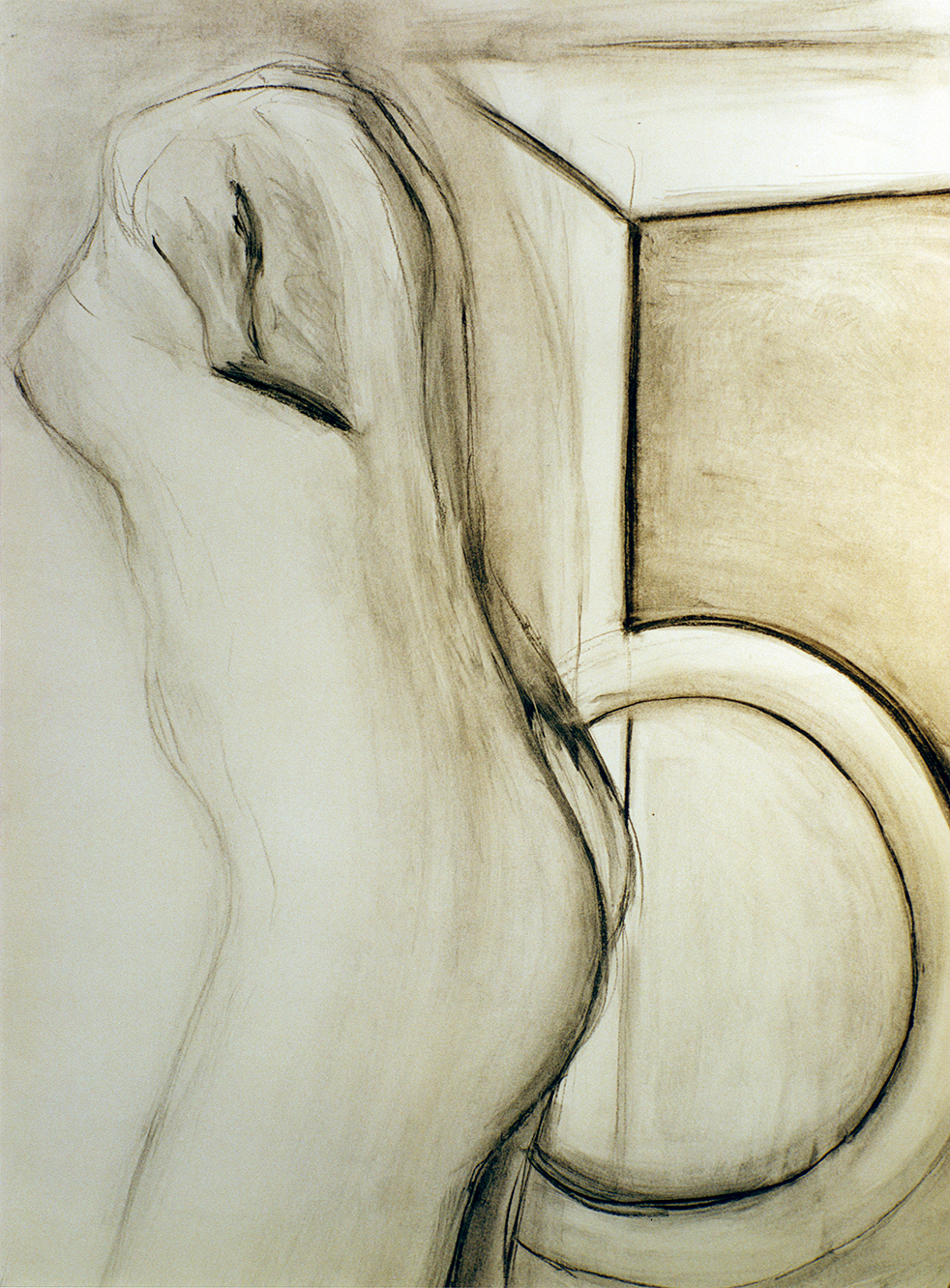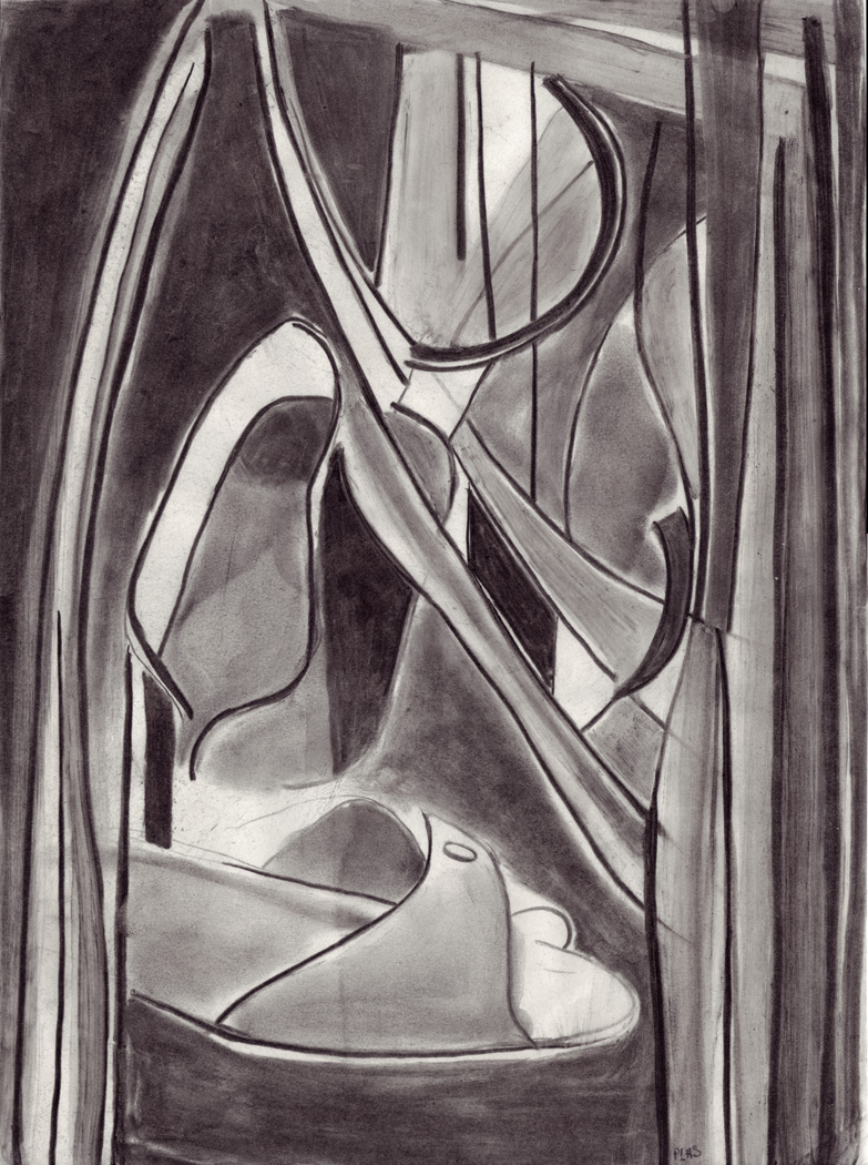 L’avantage du fusain, c’est qu’il n’y a qu’une seule couleur. Dans mes peintures, je ne parviens pas à rester dans les mêmes tons, ça finit toujours par partir dans tous les sens et dans des couleurs extrêmes alors qu’au départ je voudrais faire quelque-chose de presque monochromatique. Mais comme je n’ai jamais eu l’impression d’y parvenir, il a chaque fois fallu que j’ajoute des autres couleurs pour essayer que ça tienne la route et finalement toutes les couleurs y passent pour essayer de revenir à l’essentiel qui s’éloigne évidemment un peu plus à chaque nouvelle couleur. Pourtant je ne voulais pas et mon esquisse au fusain qui se trouve en dessous, je la trouvais pourtant si bien mais elle est devenue inacessible et il n’y a plus que moi qui peut encore la deviner avec déception.